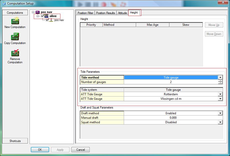 By selecting the object, in this example 'olive', and pressing the Height tab, the appropriate fields for setting up the tide parameters are displayed. As Tide method select Tide gauge. The number of tide gauges can be selected. In this example we use two to demonstrate interpolation. The ATT Tide stations selected in the Database Setup are displayed. The Tide systems here are Rotterdam and Vlissingen.