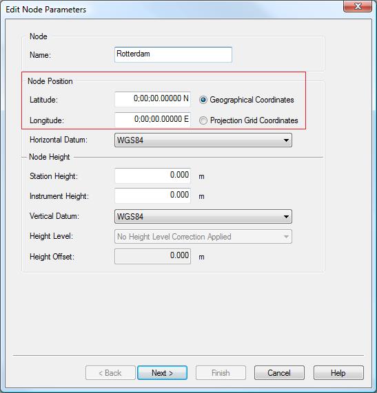 The first dialog shown requires information about the fixed node location. Information such as the horizontal and vertical datum, station height and instrument height can be added here.