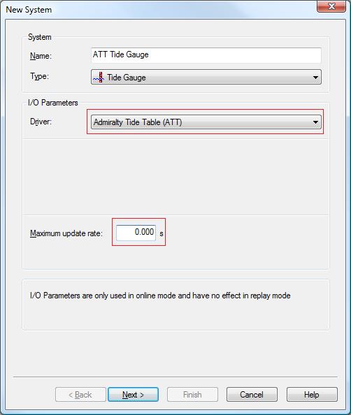 Choose "Tide Gauge" as the type of input. This system uses the "Admiralty Tide Table (ATT)" as driver. The update rate determines how frequently the tidal information should be calculated. If the update rate is left at zero, the tidal information is calculated at a frequency of one Hertz.