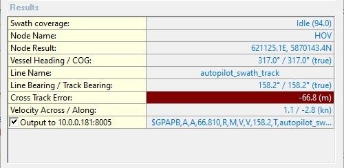 Predicted Distance: | This result is only visible when using a virtual predicted node position. It reflects the distance between the actual node position and the calculated predicted position, using the prediction time setting, the current heading and rate-of-turn of the vessel. |