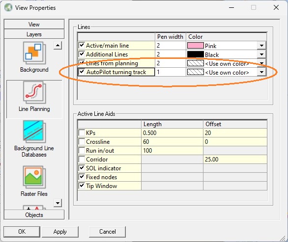 Open your Navigation Display, select 'View Properties', 'Layers', 'Line Planning' and make sure to check the 'AutoPilot turning track' option.