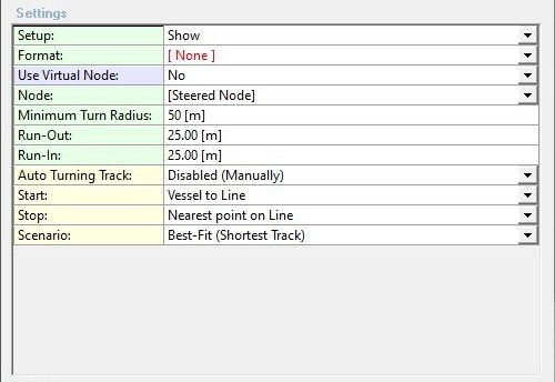 Same Direction Threshold: | This setting affects the minimum turn radius in order to approach the next line. It means that when the vessel (start point) is already approaching the line (i.e. both have same direction) then the track to follow will be just 'connecting the dots' instead of using mathematical turns.