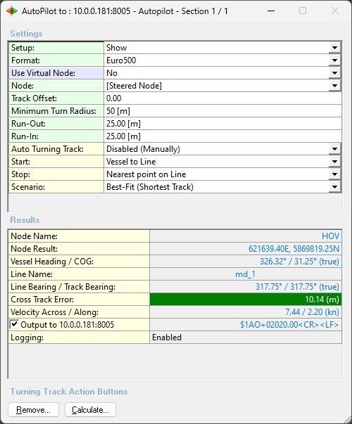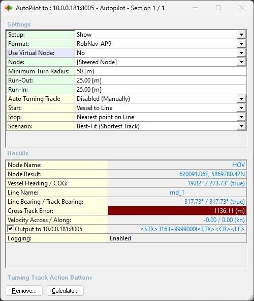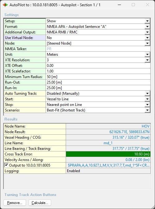 Output to I/O port | The ASCII data string that will be outputted to the selected serial COM or network TCP port. If you disable the checkbox it will put the data output on hold. In that case values will be updated in the Results, but are displayed in gray. Disabling the data output (temporarily) can be useful to experiment with some settings, without disrupting the Auto Pilot unit too much by sending extreme values to it. |