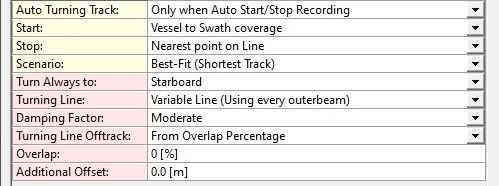 This means that the Auto Turning Track option is set to 'Only when Auto Start/Stop Recording' and Start is 'Vessel to Swath coverage'.