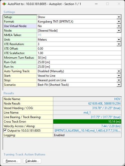 - The unit for the outputted cross track error value (XTE) is default set to Meters ('M') but can be changed under Settings in the driver's dialog.