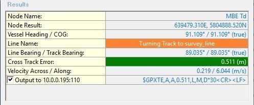 The 'Cross Track Error' row is colored red when the node location is at port side and colored green when at starboard side.This is an example when the calculated turning track is being used: