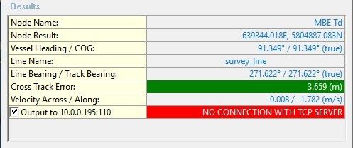The 'Cross Track Error' row is colored red when the node location is at port side and colored green when at starboard side.This is an example when no network connection could be made between the Qinsy computer and the Auto Pilot unit: