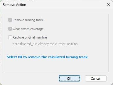 Remove... | This will invoke a dialog that allows the user to manually remove the current calculated turning track and from that moment on the driver will use the co-ordinates of the Controller's mainline again in order to determine the cross track error (XTE or distance across). The exact remove action upon OK depends on the current situation and settings. ![]() When an option is grayed out it means it can't be changed for current situation so that option will be the default. For example in the above dialog the turning track will be removed (first checkbox) and the collected swath coverage will be cleared (second checkbox). So after this action you can't manually calculate a new turning track to the past swath coverage; but the driver will start collecting new outer beam information as soon as the Controller started the auto recording. The option to restore the original mainline is only applicable when Advanced Setting 'Update Controller Mainline' is enabled. In that case the mainline was (temporary) replaced by the 'autopilot_swath_track'. |