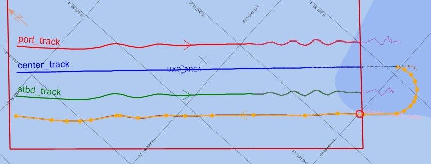 Below two examples of the turning track based on the same swath coverage: ![]() ![]() Changing this setting when your vessel is 'outside' the selected survey area will automatically re-calculate the (current) turning track . |