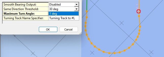 With the settings from the above example, the Navigation Display may look like this, after hitting the Calculate Turning Track button: