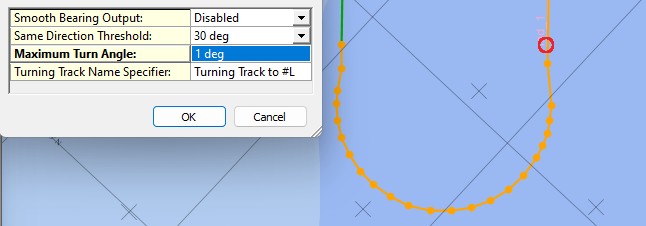 With the settings from the above example, the Navigation Display may look like this, after hitting the Calculate Turning Track button: