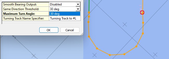 Maximum Turn Angle: | Set the maximum turn angle for the turning circle sections. A turn angle from one section waypoint to the next will never exceed this value. Enter a value between 1 and 30 deg The default maximum turn angle is 5 deg Below two examples of the same calculated turning track, the first one with a max turn angle of 1 and the second one of 30 degree: ![]() ![]() Playing with his setting may affect the behavior of your auto pilot unit: ever section change along the turn will output a different 'cross track error' and 'heading-to-steer' - change. |