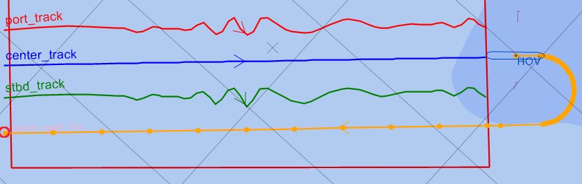 Below three examples of the turning track based on the same swath coverage, the first using 'None', the second one 'Moderate' and the third one 'Heavy': ![]() ![]() ![]() Changing the damping factor when your vessel is 'outside' the selected survey area will automatically re-calculate the (current) turning track . |