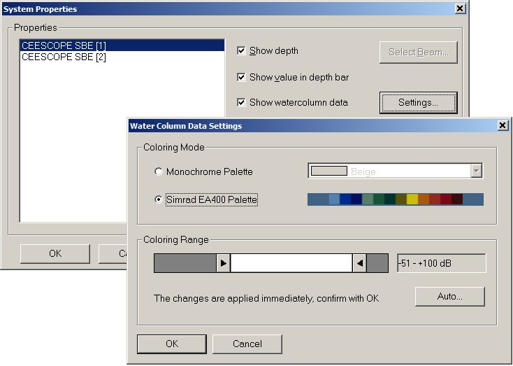 The decoded depth and raw acoustic samples (a.k.a. water-column) can be visualized using an Echosounder Display: