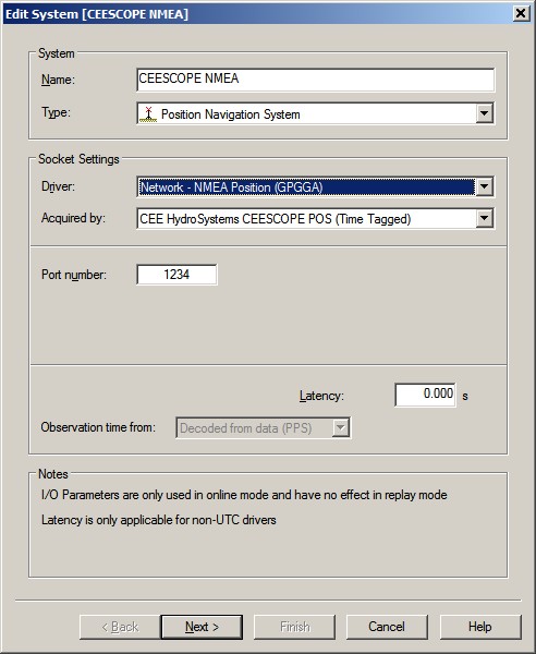 -- The Observation name can be any free text, with a maximum of 16 characters.In order to decode the Position Data coming from the internal or external GNSS receiver connected to the CEESCOPE unit, add a Position Navigation system to your template setup and select driver "Network - NMEA Position and Heading (Checksum)", or "NMEA Position and Heading (Checksum)" for the serial variant.