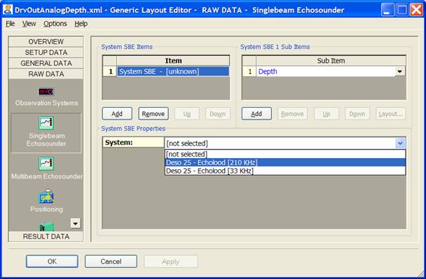 This will open the Generic Layout Editor. Select the RAW DATA column, highlight the System SBE Item, and change the [not selected] entry into the echosounder that you want to use.