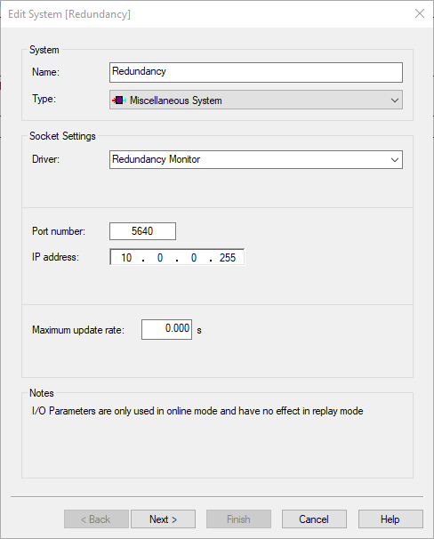 Add a driver of the type Miscellaneous to the setup and use the driver 'Redundancy Monitor'. Normally, the IP address can be left at the default value of '0.0.0.0' (a broadcast on the current network). When specifically required, a specific broadcast domain (e.g. 192.168.255.128) can be entered. In this case, the user has to make sure that the broadcast address matches the network's network mask.