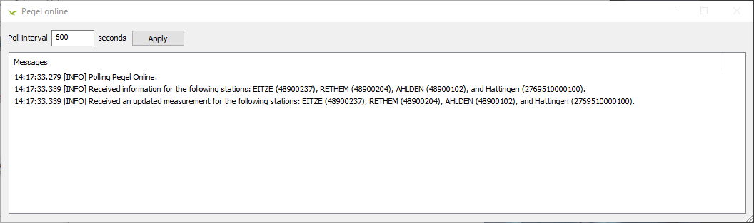Note that the tides are updated in different intervals (3-10 Min). The driver is only requesting updates for the stations added to the Pegel Online system in the (database) setup.