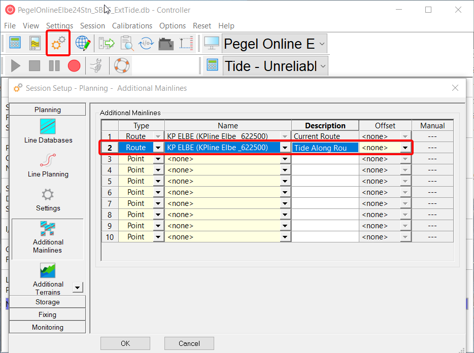 Select a route for the second mainline If note route is selected in the second mainline, the first mainline (= active survey line) is used, which can lead to strange effects when the active survey line is changed.