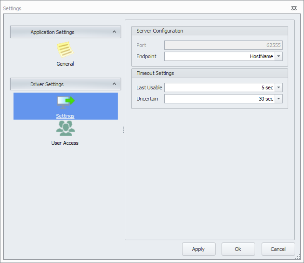 Settings | Opens the settings for the OPC UA server. More info below. |
