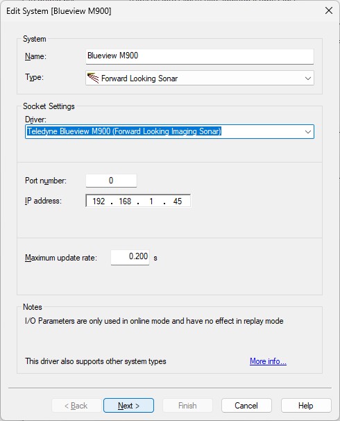 Add a Forward Looking Sonar to your template setup and select driver: "Teledyne Blueview M900 (Forward Looking Imaging Sonar)"