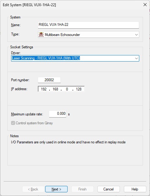 Therefore add a Multibeam Echosounder system to your template setup and select driver "Laser Scanning - RIEGL VUX-1HA-22 (With UTC)”