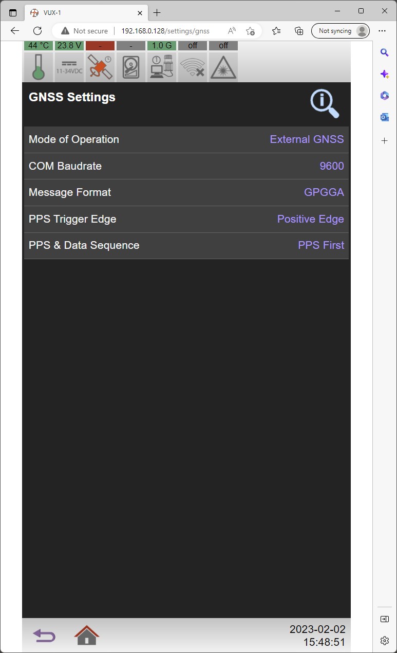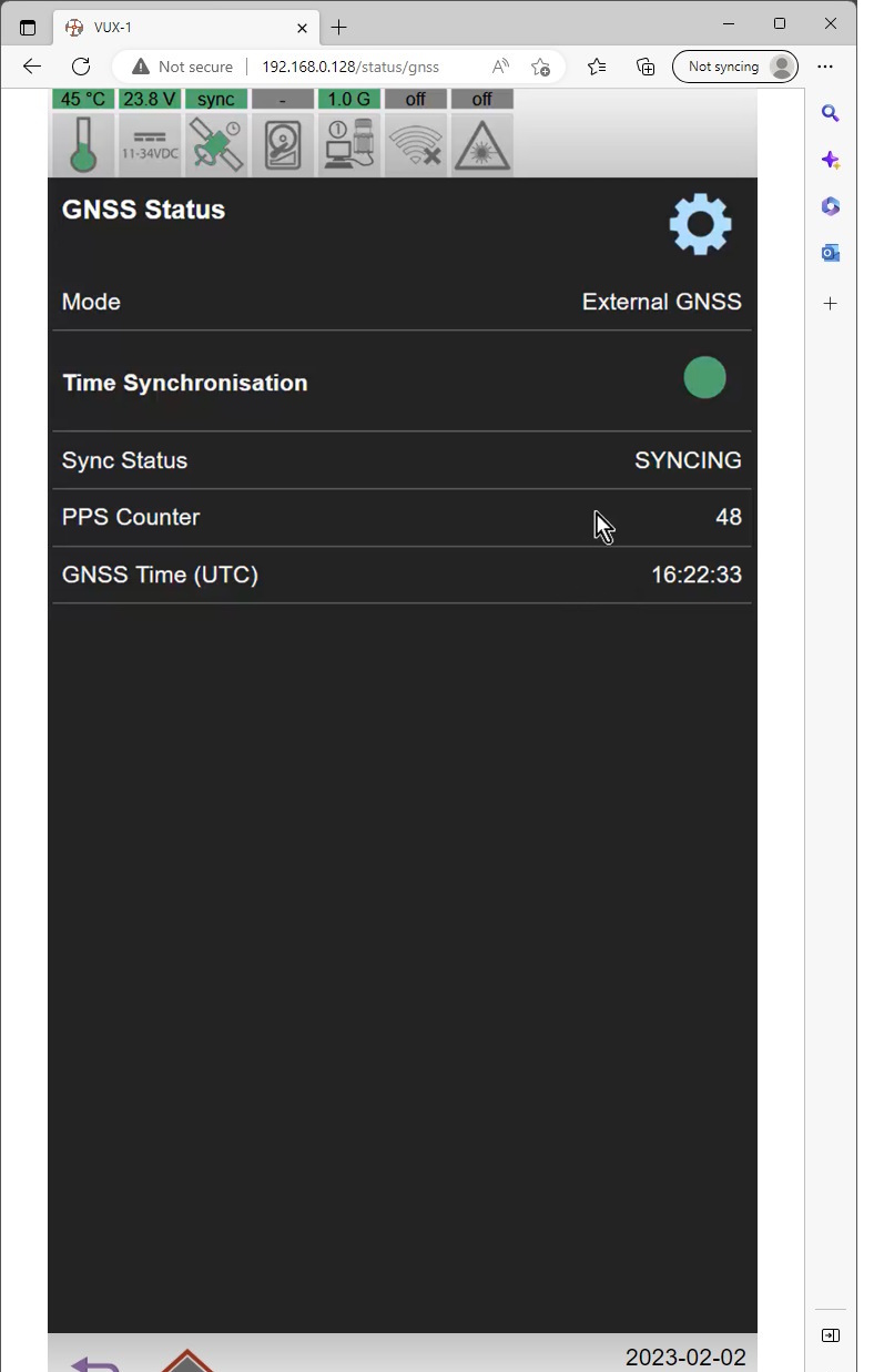 or the VUX-1HA Time Synchronization status is not 'Sync' (check WebGUI GNSS Status page)