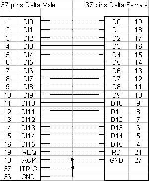 37 pins delta male to 37 pins female delta loop back cable. This cable connects the PCI 7200 Daq Card's 37 pins female connector with the 37 pins male connector of the ribbon cable. Note that this cable is not 1 on 1 wired, the wiring schedule can be found below.
