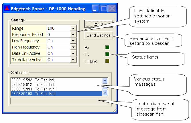 The control driver has two tasks, the first is to provide the user with the user interface to control the operational settings of the Df-1000 sidescan system.