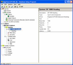 Add a new system of type "Gyro's and Compasses" and select driver "Edgetech DF-1000 Sidescan (Heading)". Select same com port and com parameters as the control driver.