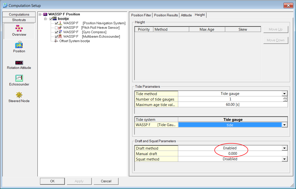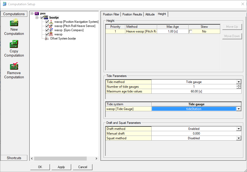 If a Tide Gauge system was added to the database, the tide information from the WASSP x230 unit can be used by Qinsy. This is set up in the Computation Setup by selecting the computation and opening the Height tab.