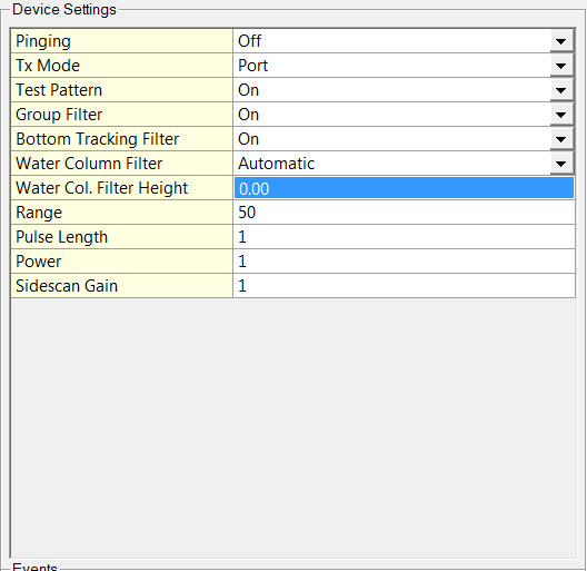 The operating settings of the sonar are modified through the Echosounder Settings dialog Control tab of the Controller.