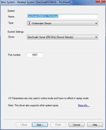 First add an Underwater sensor "GeoSwath Sonar (xxx KHz) (Sound Velocity)" in order to decode the sound velocity, with xxx the frequency of your Geoswath system; select port number 5001.
