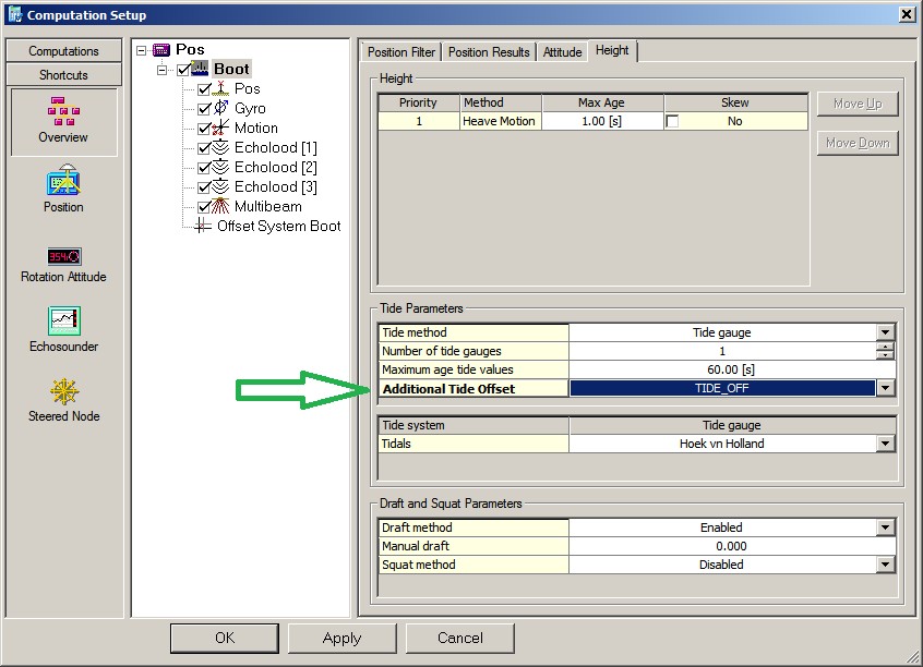 Highlight your vessel object in the Controller's Computation Setup, select the Height tab page, and select the Additional Tide Offset observation in the Tide Parameters.