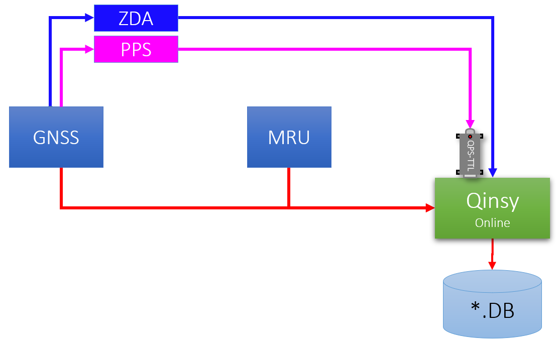 The Qinsy time stamping mechanism is based on the 1 pulse per second (Time Synchronization) signal transmitted from GNSS receivers.