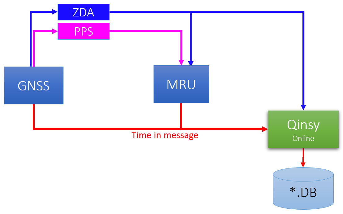 The scheme below shows a PPS (pulse per second) signal and ZDA message that are being transmitted from a GNSS receiver. The MRU does not receive any information about timing.