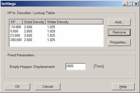 The user must define a KP versus water density / solid density table and the empty hopper displacement.