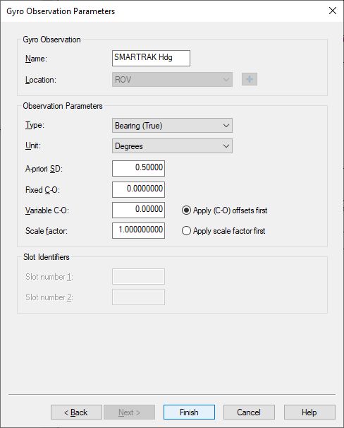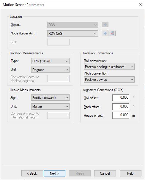 Normally this will be the node location (center of array) of the SMARTRAK unit mounted on the ROV.Leave the sign conventions at their defaults: roll positive heeling to starboard, pitch positive bow up.