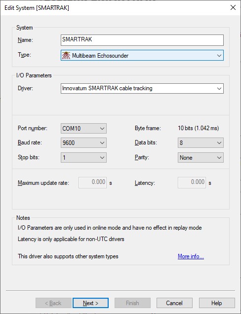 Add a Multibeam Echosounder System to your template setup and select driver "Innovatum SMARTRAK cable tracking".
