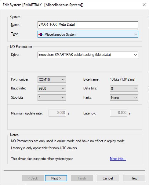 Add a Miscellaneous System to your template setup and select driver "Innovatum SMARTRAK cable tracking (Metadata)".