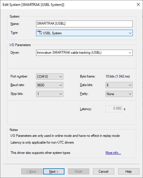 Add a USBL System to your template setup and select driver "Innovatum SMARTRAK cable tracking (USBL)".