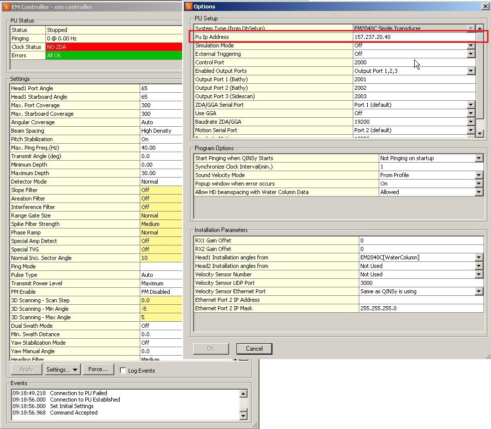 Online the EM Controller settings should state the correct PU IP Address for the specific multibeam: