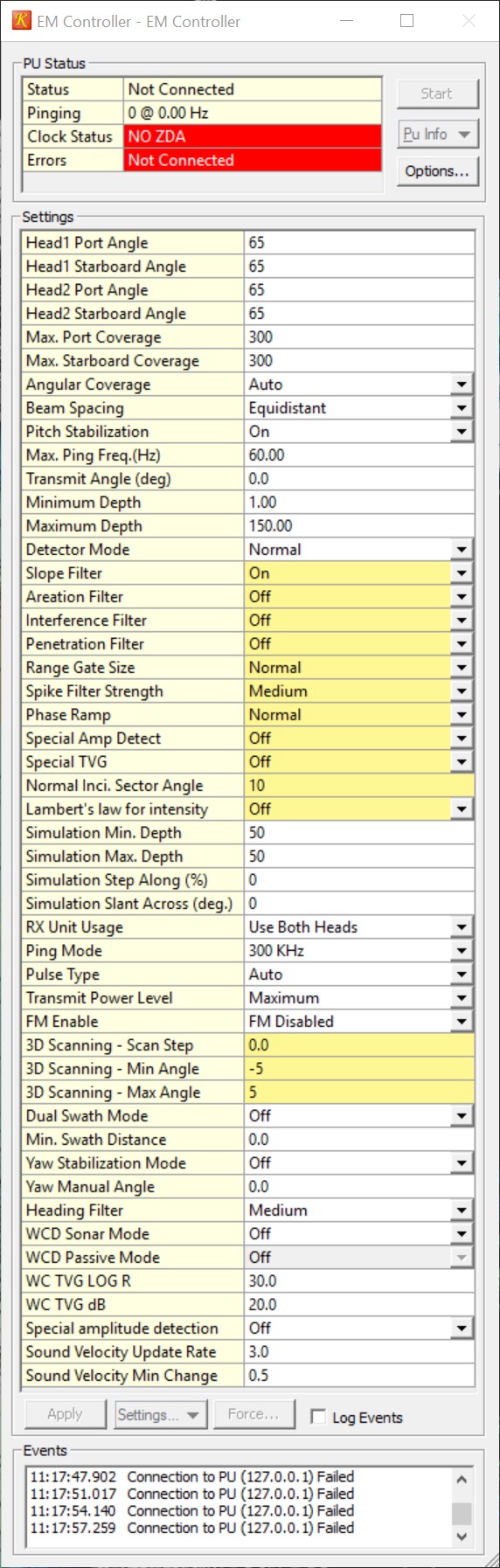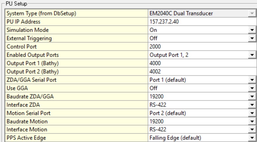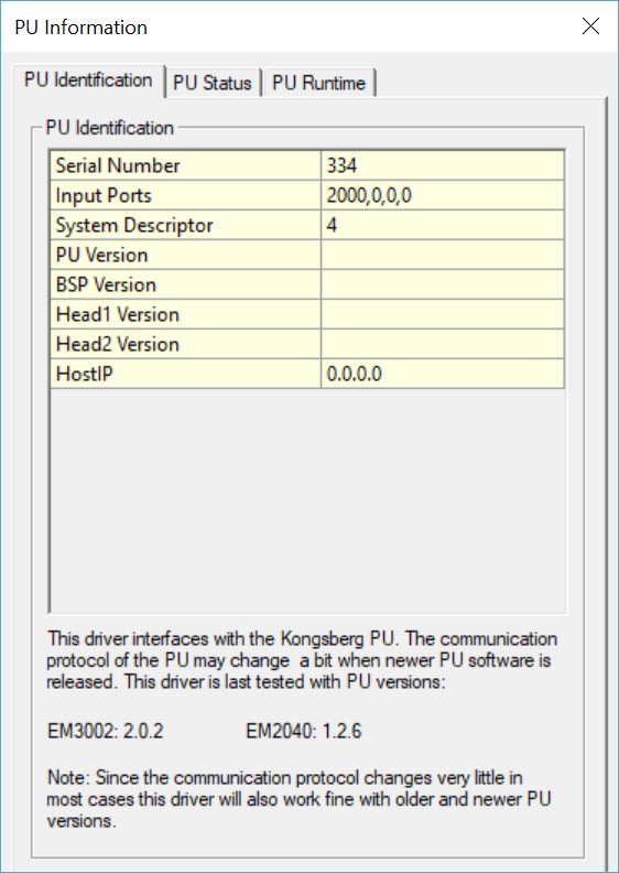 PU IP Address | This is the IP address of the topside EM3002 Processor Unit (PU). The default value is 157.237.2.61 for EM3002 and 157.237.20.40 for EM2040(C) but this may be different for you unit. If the IP number is incorrect then the driver will not have a connection with the PU.