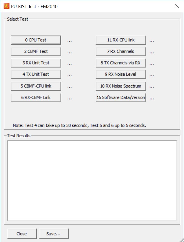 The BIST Test dialog is used to command the PU to perform some internal tests inside the echosounder. To start a test press one of the test buttons.