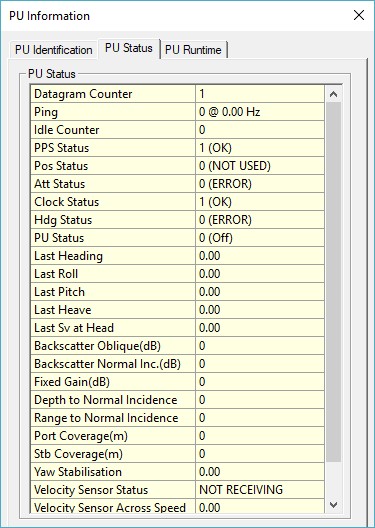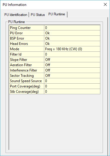 This dialog shows the Identification information of the echosounder, the contents of the last status datagram and the contents of the last received runtime datagram.