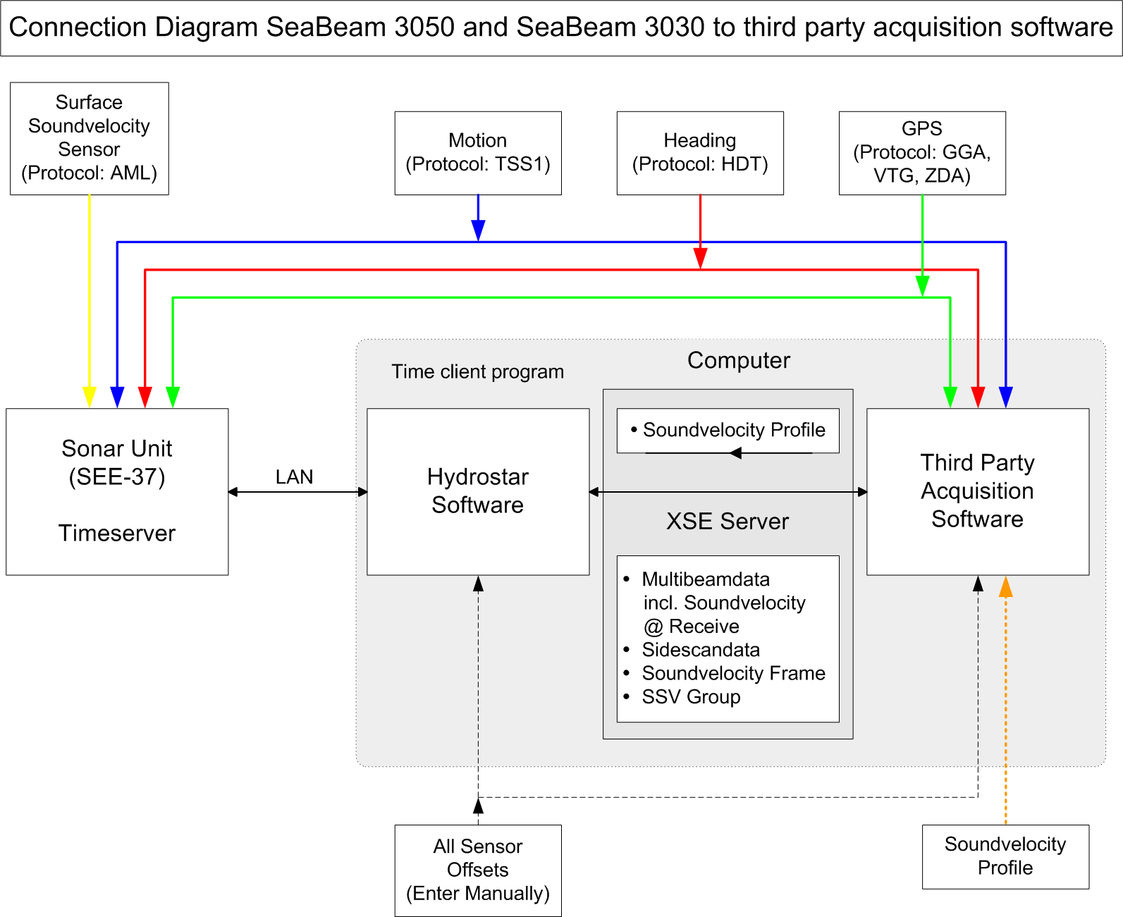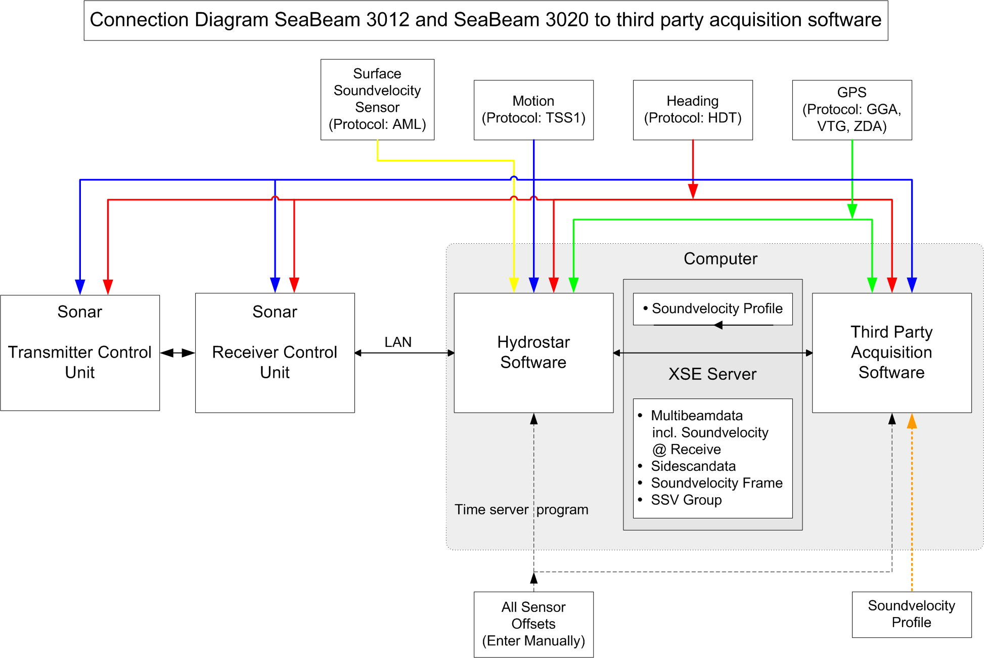 The timetag from the data packets is used and assumed to be equal to UTC time. Therefore it is required to synchronize the times of the Qinsy and the HydroStar/Seabeam system to UTC using an external time-frame (i.e. Time Synchronization interface from a GPS receiver).