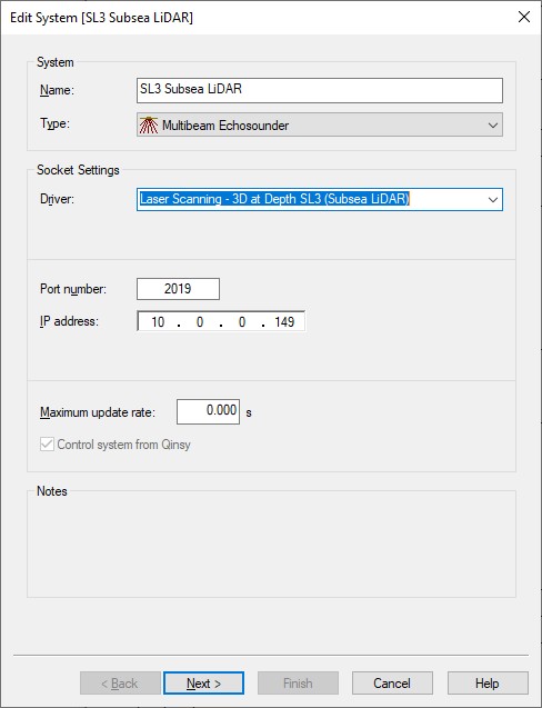 Add a Multibeam Echosounder system to your template setup and select from the driver list "Laser Scanning - 3D at Depth SL3 (Subsea LiDAR)".