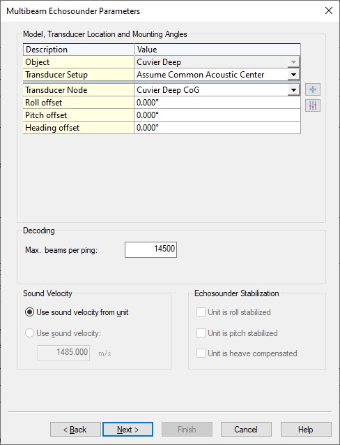 It is important to select the correct Scanner Mounting in the Qinsy Online setup: in that case you can leave the Roll, Pitch and Heading offsets close to zero so you don't have to use values anymore like +270 or -90, etc.Leave the Max. beams per ping value at 14500.
