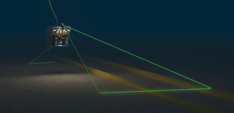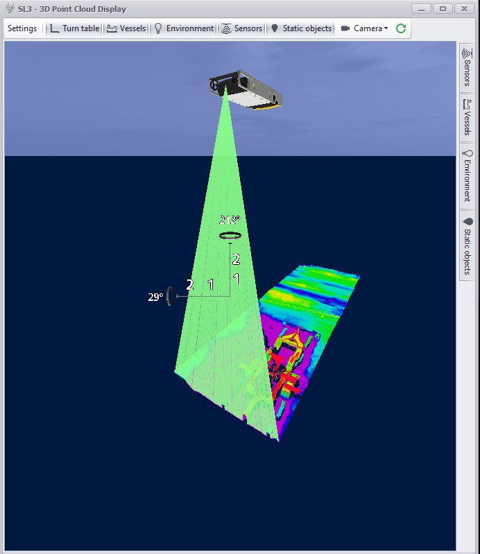 In this setup the sensor has been mounted e.g. on the front of an ROV but looking downward in order to scan the seabed for exposed pipelines.