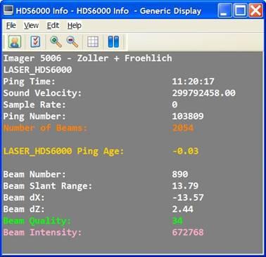 The Generic Display can be used to show the numerical values for the number of beams (pixels) being scanned per ping (line), the beam quality and intensity, the range value, etc.